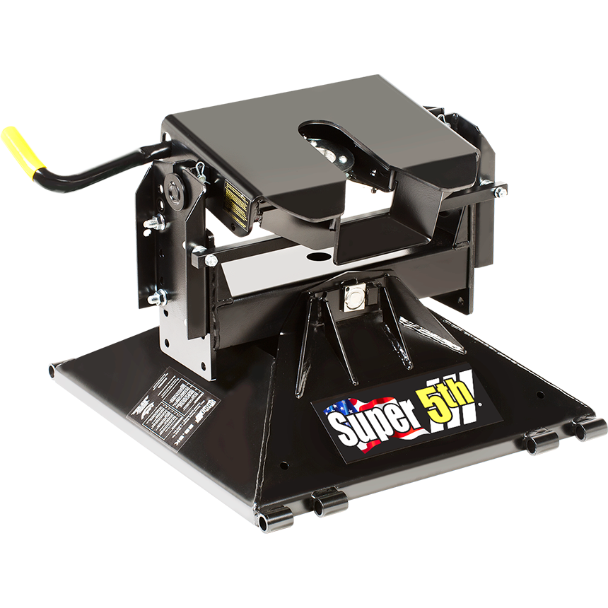 For towing the "big rigs" you will find the 25.5 superior for the task! The compact pyramid base is designed for maximum strength, yet has a pleasing appearance. Experience Super 5th's strength and security--there's no comparison! Other models include adjustable rocker arms. SuperBracket - Custom Designed Mounting Kits available for specific vehicle models providing better and stronger installations or choose the universal bracket for a lower cost option. > 25,500 lb. Towing Capacity--Pin Weight Capacity 6,375 lbs. > Side-to-side pivot feature. > Adjustable rocker arm option--adjusts heights from 15½" to 18½". > Jaw cradles the king pin for reduced wear and tighter fit. > Quick removal for full truck bed use. > Security tabs on the plate may be padlocked. > Optional Gooseneck Plate will fit existing base rails — 25K Plate w/ Ball (Part #0506).